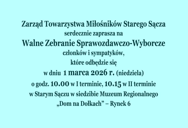Zarząd Towarzystwa Miłośników Starego Sącza serdecznie zaprasza na Walne Zebranie Sprawozdawczo-Wyborcze członków i sympatyków, które odbędzie się w dniu 1 marca 2026 r. (niedziela) o godz. 10.00 w I terminie, 10.15 w II terminie w Starym Sączu w siedzibie Muzeum…